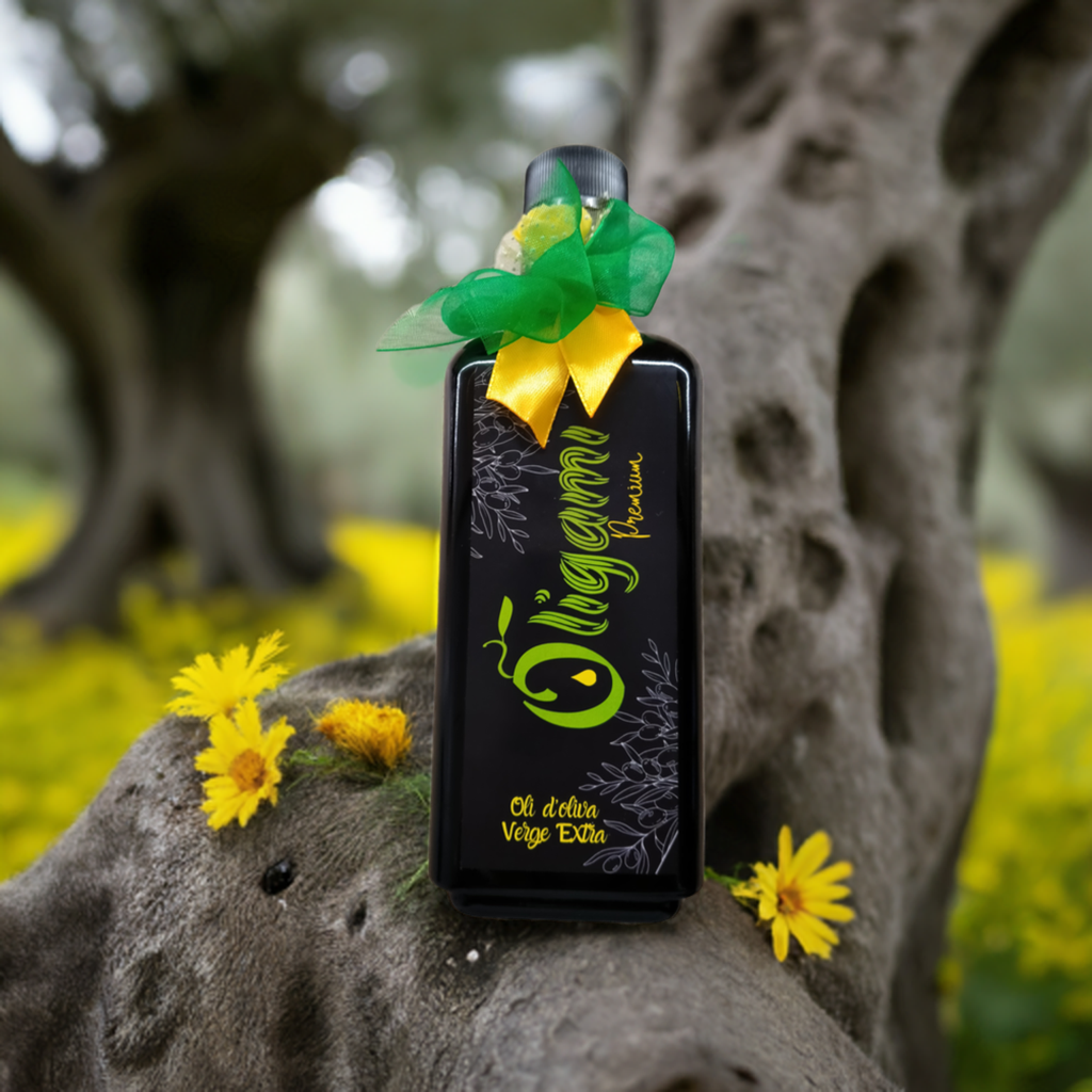 Oli d’oliva verge extra Prèmium en ampolla de 500ml monovarietal 100% arbequina primerenca i 100% ecològic fan d’aquest oli característic per al seu color verd intens destacant els seus atributs positius afruitats verd com la tomaquera, ametlla, fonoll, cartxofa…